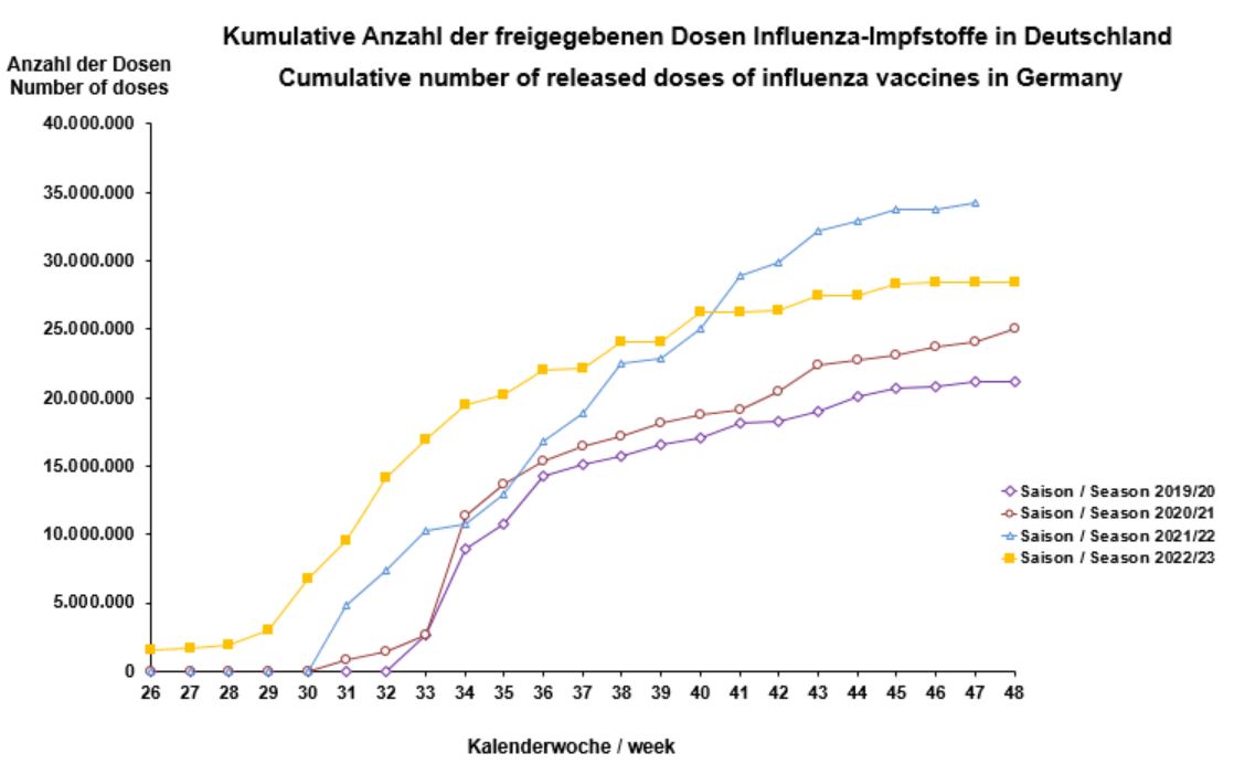 Ärzteschaft Praxen sollten Grippe-Impfstoffe für 202223 jetzt bestellen Mittwoch 2. Auch in der Grippesaison 202223 können Ab-60-Jährige mit anderen Grippeimpfstoffen als nur Efluelda geimpft werden. Das PEI hat schon 67 Millionen Dosen Grippeimpfstoff. Die deutsche Zulassungsbehörde das Paul-Ehrlich-Institut hat bislang mehr als 20 Millionen Grippe-Impfstoffdosen freigegeben fast doppelt so viele wie im Vorjahr.